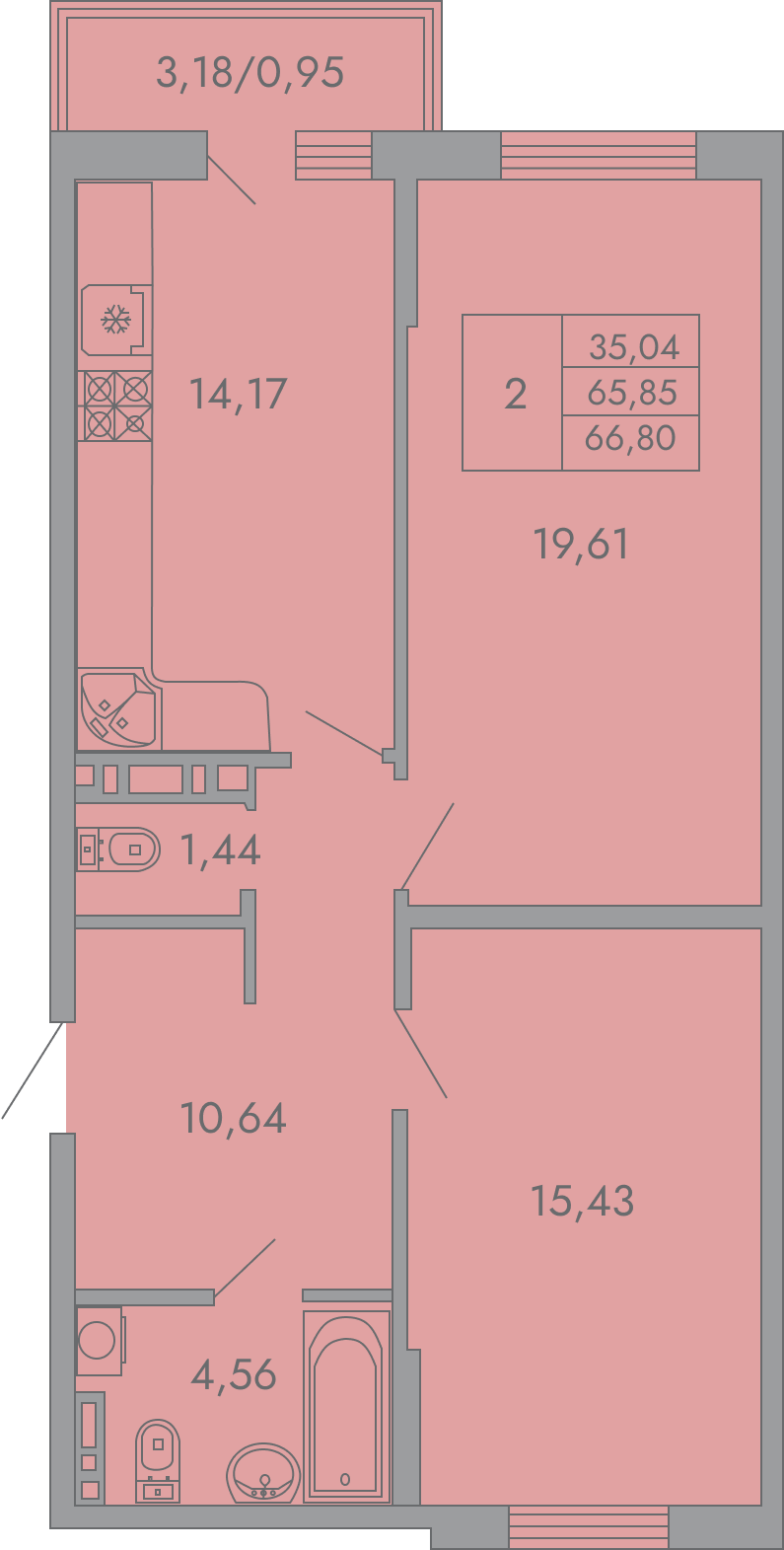 2-комн. планировка 66.80 м² в ЖК «Рокада»