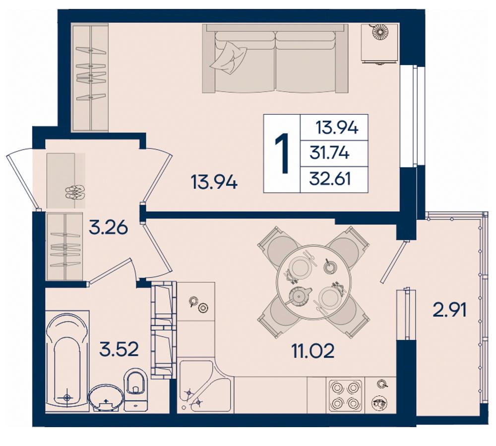 1-комн. планировка 32.61 м² в ЖК «Дом 101»