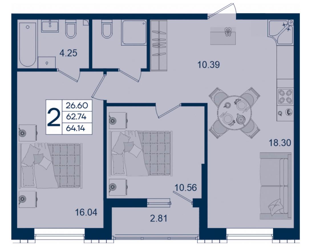 2-комн. планировка 64.10 м² в ЖК «Дом 101»