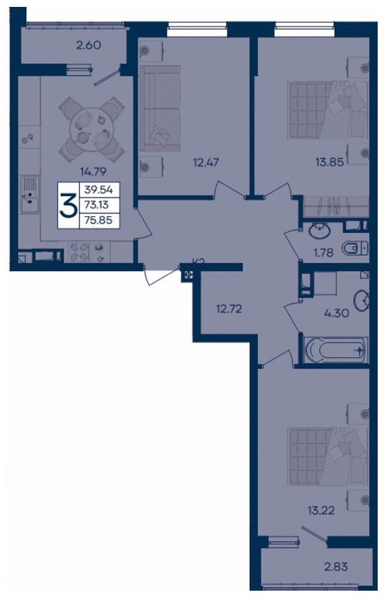 3-комн. планировка 75.85 м² в ЖК «Дом 101»