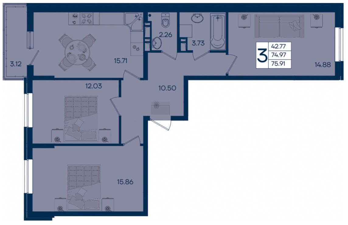3-комн. планировка 75.91 м² в ЖК «Дом 101»