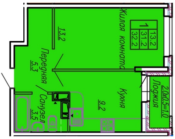 1-комн. планировка 32.00 м² в ЖК «Акварели 3»