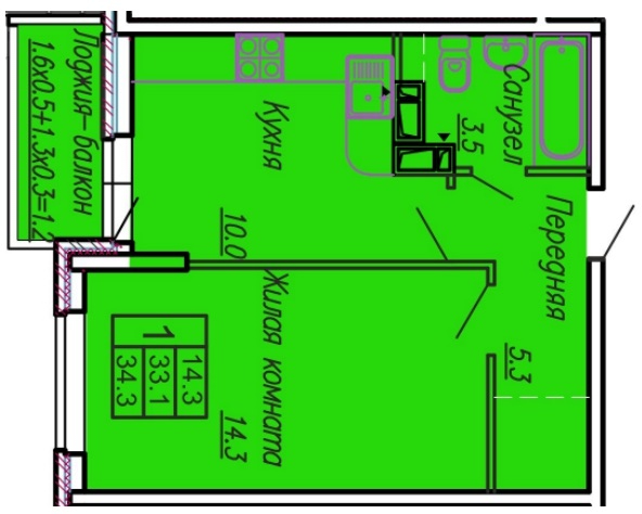 1-комн. планировка 34.00 м² в ЖК «Акварели 3»