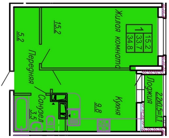 1-комн. планировка 35.00 м² в ЖК «Акварели 3»
