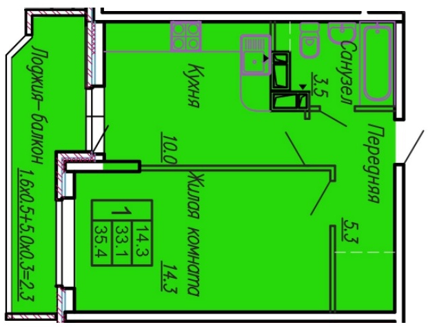 1-комн. планировка 35.00 м² в ЖК «Акварели 3»