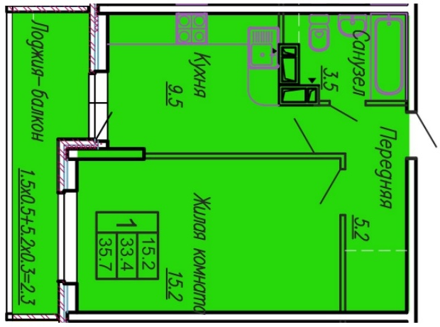 1-комн. планировка 36.00 м² в ЖК «Акварели 3»