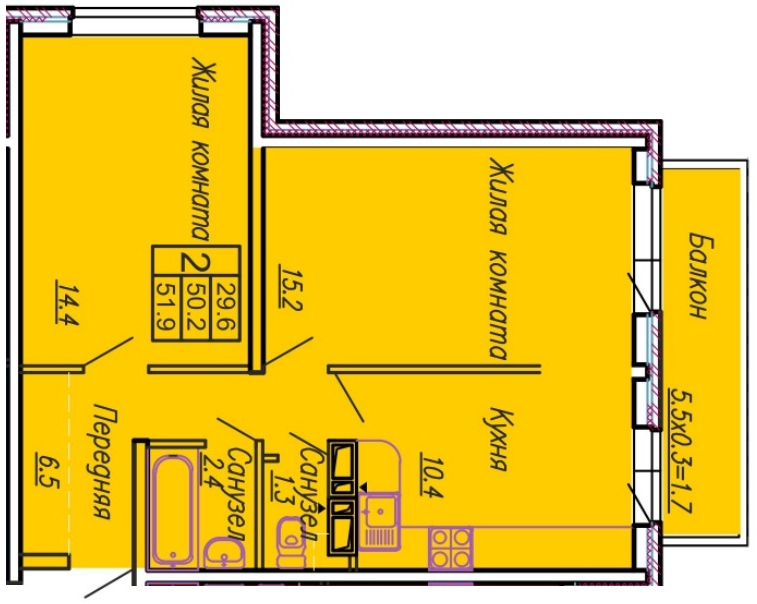2-комн. планировка 52.00 м² в ЖК «Акварели 3»