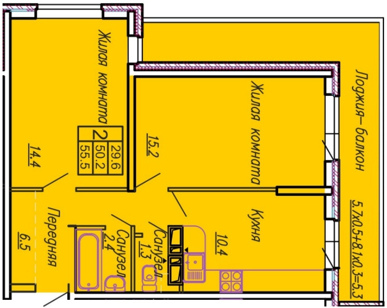 2-комн. планировка 56.00 м² в ЖК «Акварели 3»