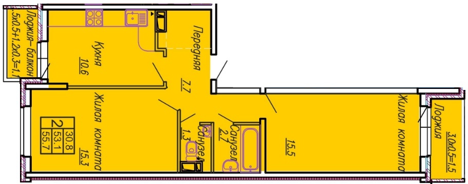 2-комн. планировка 56.00 м² в ЖК «Акварели 3»