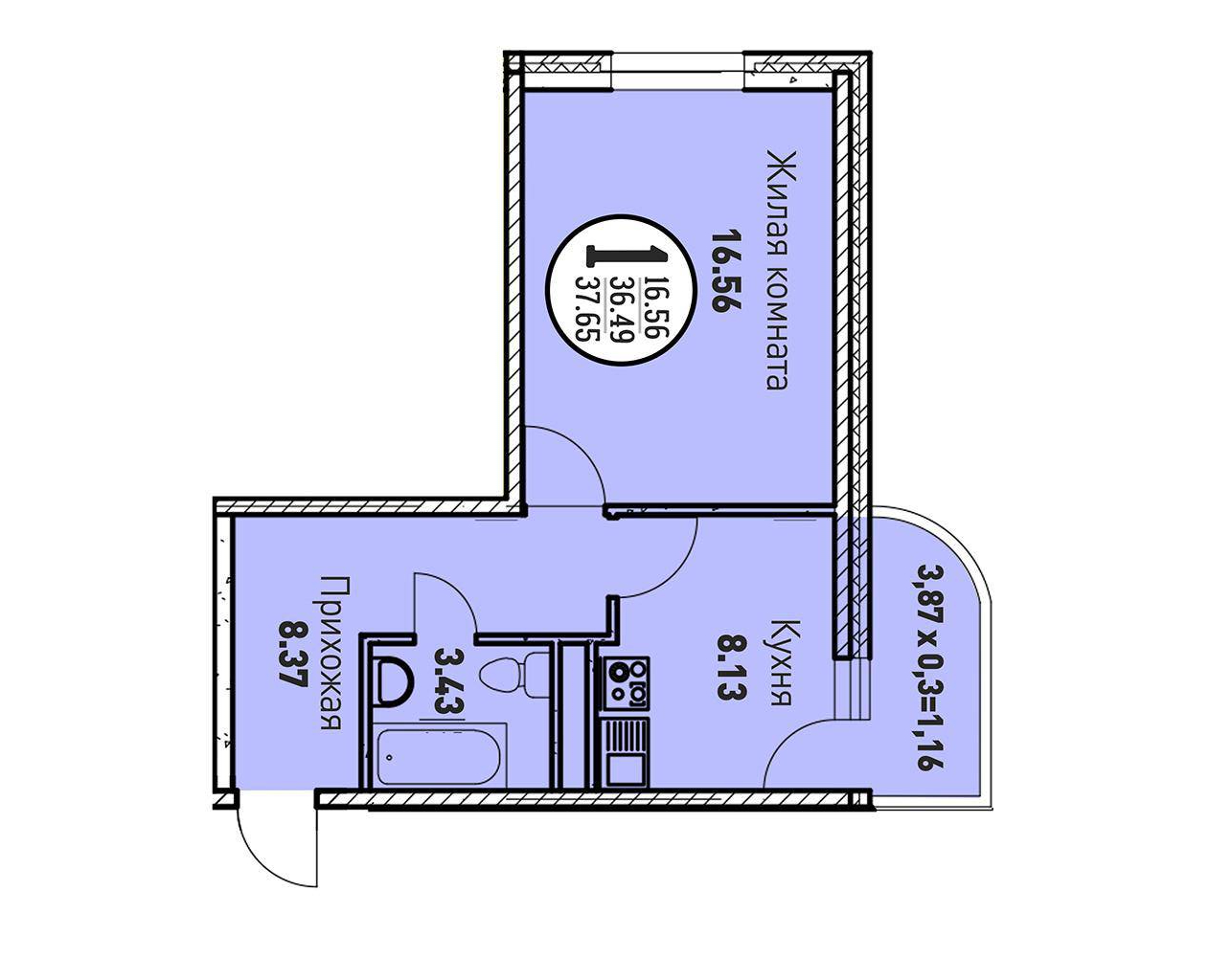1-комн. планировка 37.70 м² в ЖК «Цветы»