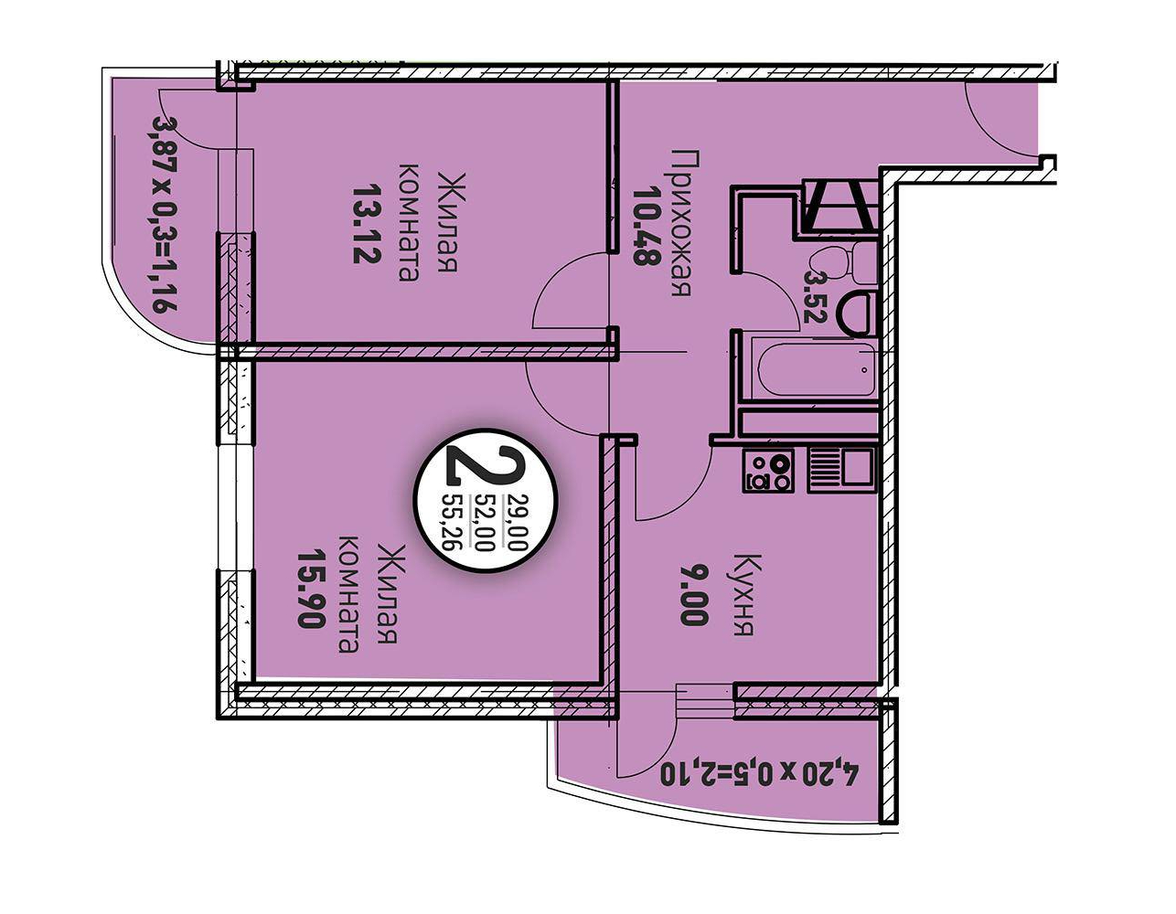 2-комн. планировка 55.30 м² в ЖК «Цветы»