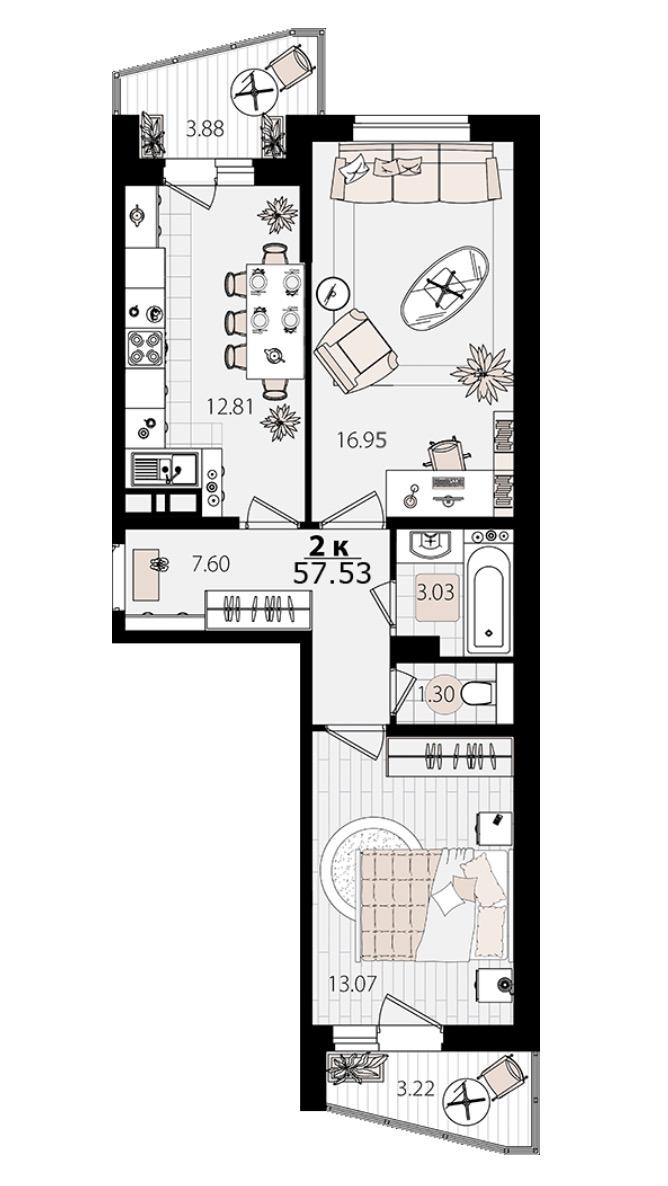 2-комн. планировка 57.50 м² в ЖК «Дом на Луговой»
