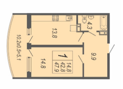 1-комн. планировка 48.00 м² в ЖК «Дружный»