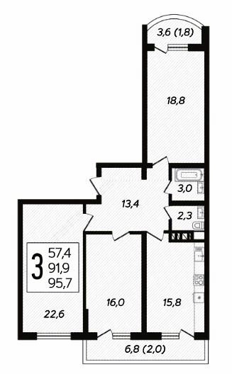 3-комн. планировка 95.73 м² в ЖК «Fresh»