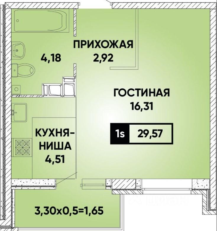 1-комн. планировка 29.57 м² в ЖК «Губернский»