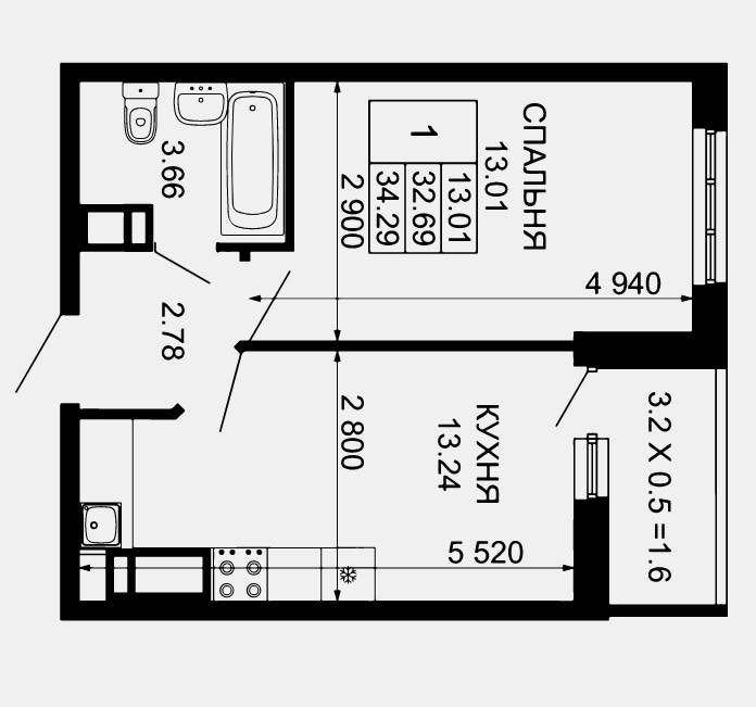 1-комн. планировка 34.30 м² в ЖК «Лучший»