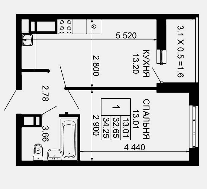 1-комн. планировка 34.20 м² в ЖК «Лучший»