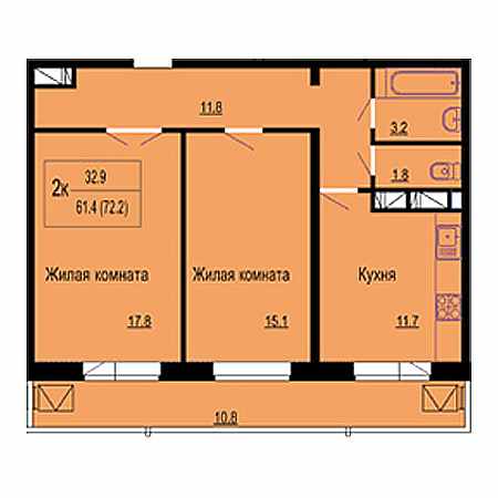 2-комн. планировка 72.20 м² в ЖК «Мелодия»