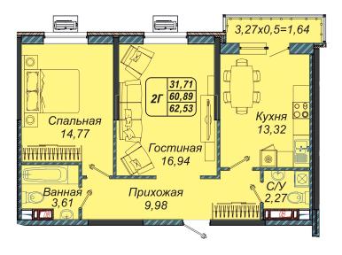 2-комн. планировка 63.00 м² в ЖК «Парковый»