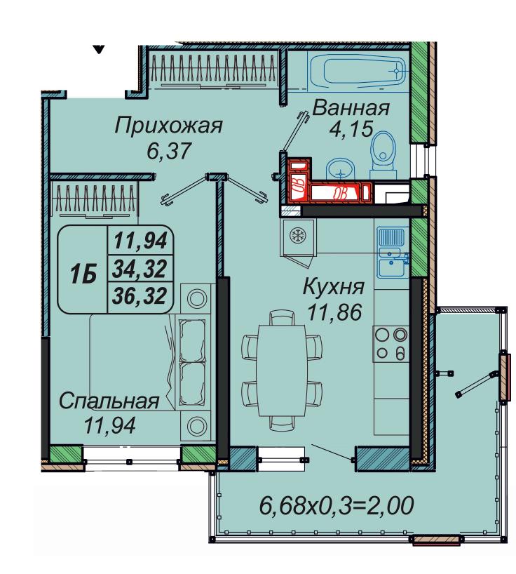1-комн. планировка 36.32 м² в ЖК «Парковый»