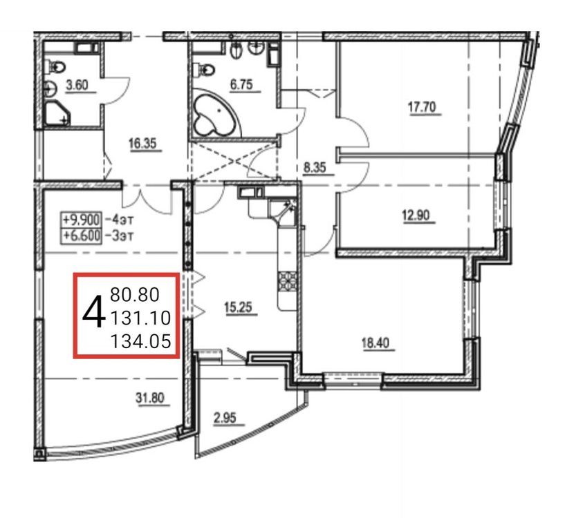 4-комн. планировка 134.05 м² в ЖК «Ривьера»