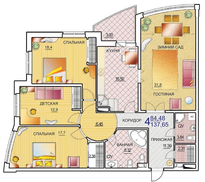 4-комн. планировка 137.65 м² в ЖК «Ривьера»