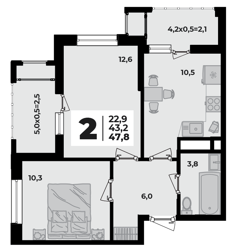 2-комн. планировка 47.80 м² в ЖК «Родной Дом 5»
