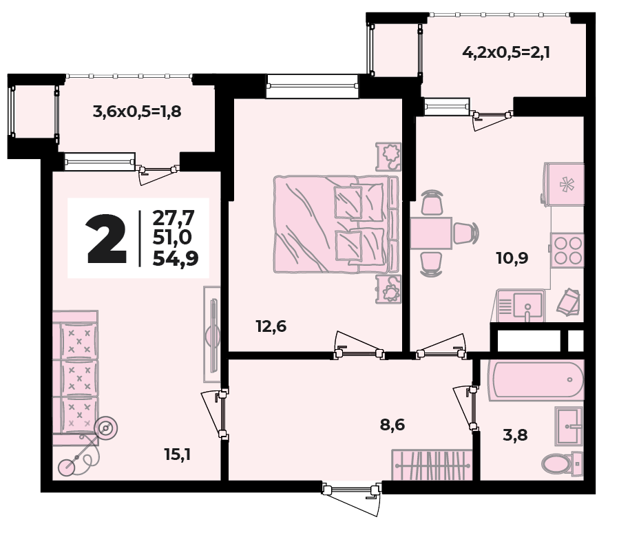 2-комн. планировка 54.90 м² в ЖК «Родной Дом 5»