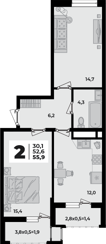 2-комн. планировка 55.90 м² в ЖК «Родной Дом 5»