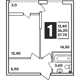 1-комн. планировка 37.70 м² в ЖК «Самолет»