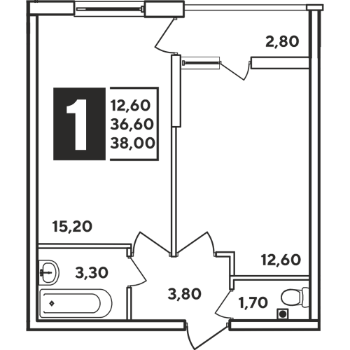 1-комн. планировка 38.80 м² в ЖК «Самолет»