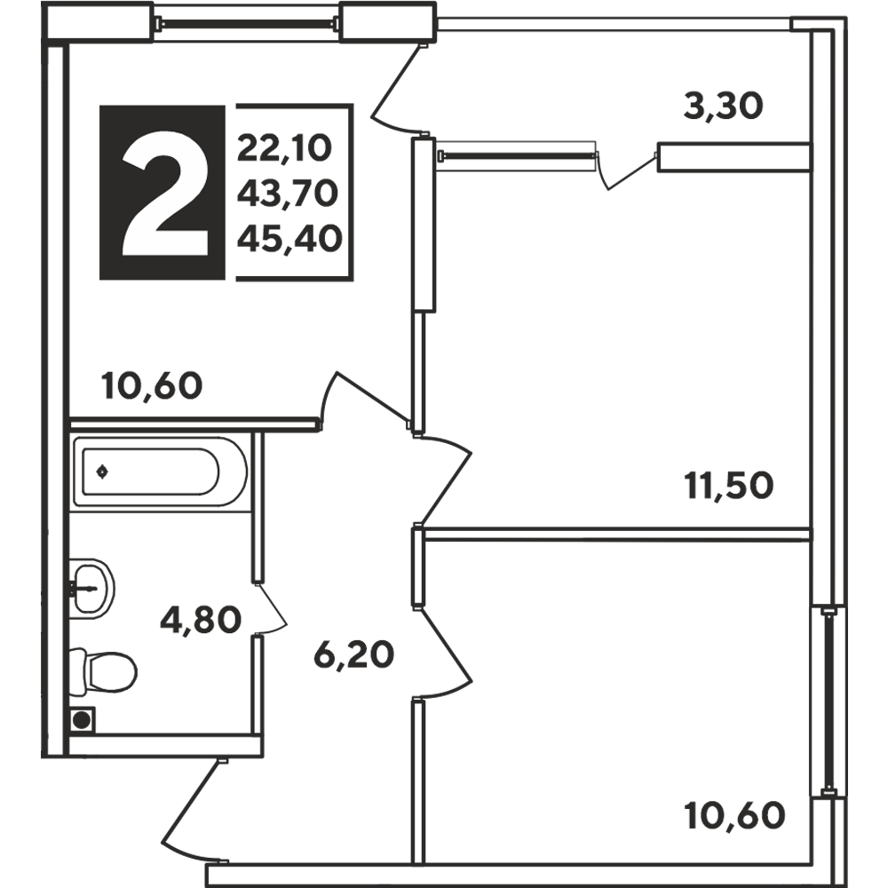 2-комн. планировка 45.50 м² в ЖК «Самолет»
