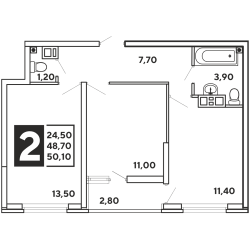 2-комн. планировка 50.10 м² в ЖК «Самолет»