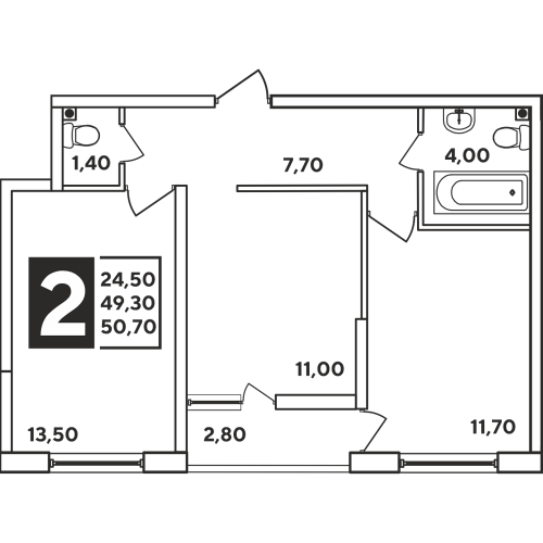 2-комн. планировка 50.70 м² в ЖК «Самолет»