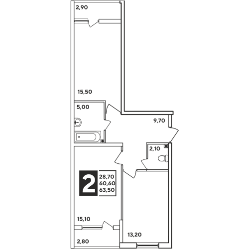 2-комн. планировка 63.50 м² в ЖК «Самолет»