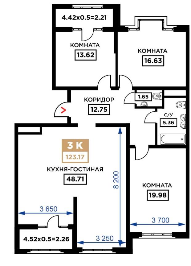 3-комн. планировка 123.17 м² в ЖК «Сердце»