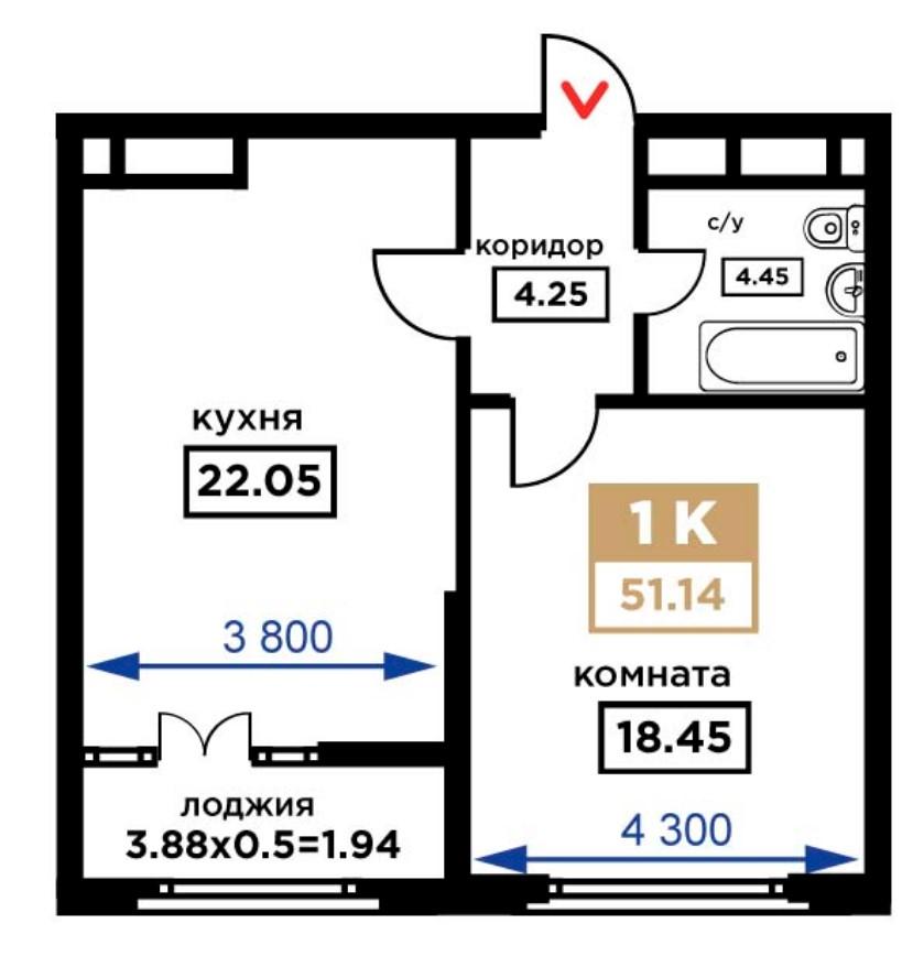 1-комн. планировка 51.14 м² в ЖК «Сердце»