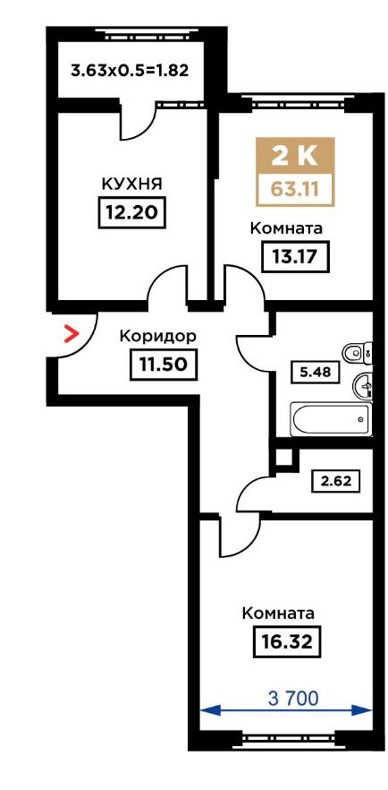 2-комн. планировка 63.11 м² в ЖК «Сердце»