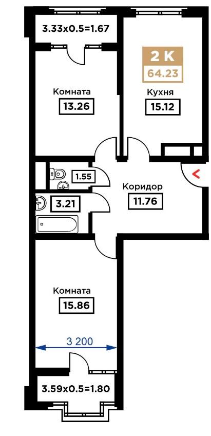 2-комн. планировка 64.23 м² в ЖК «Сердце»