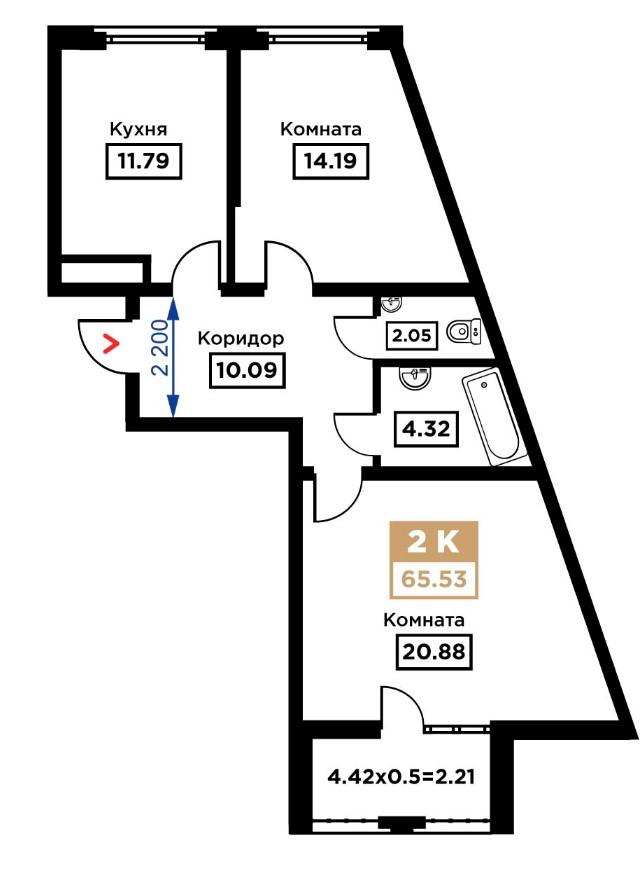2-комн. планировка 65.53 м² в ЖК «Сердце»