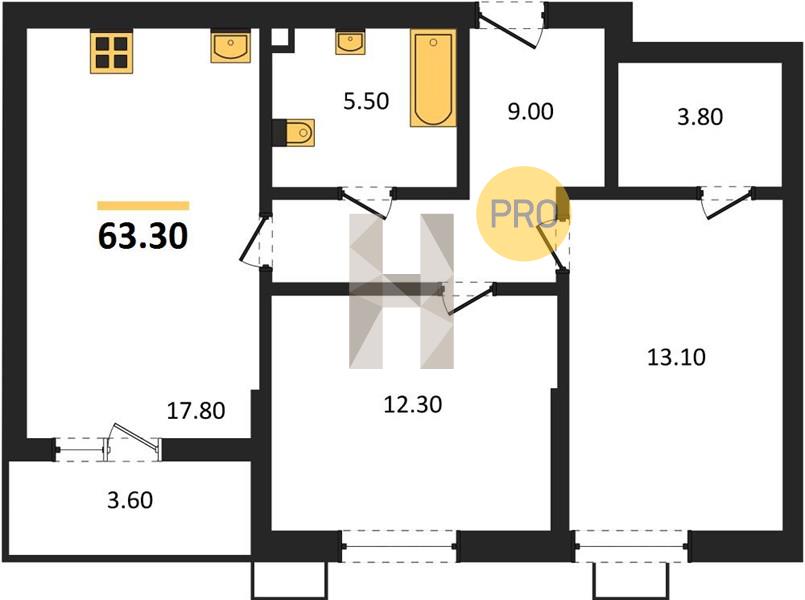 2-комн. квартира 63.30 м² в ЖК «Звезды»