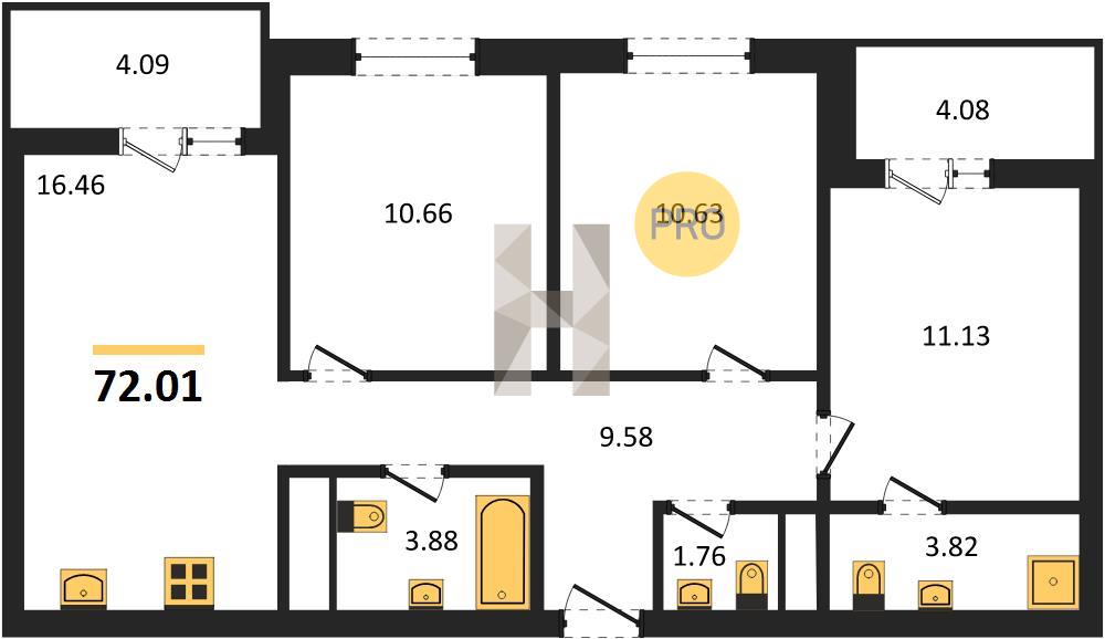 3-комн. квартира 72.30 м² в ЖК «Теплые Края»