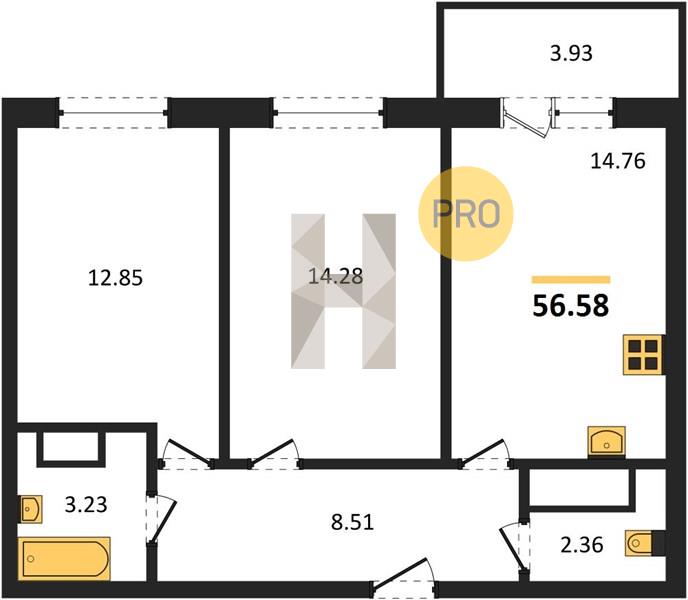 2-комн. квартира 56.58 м² в ЖК «Теплые Края»