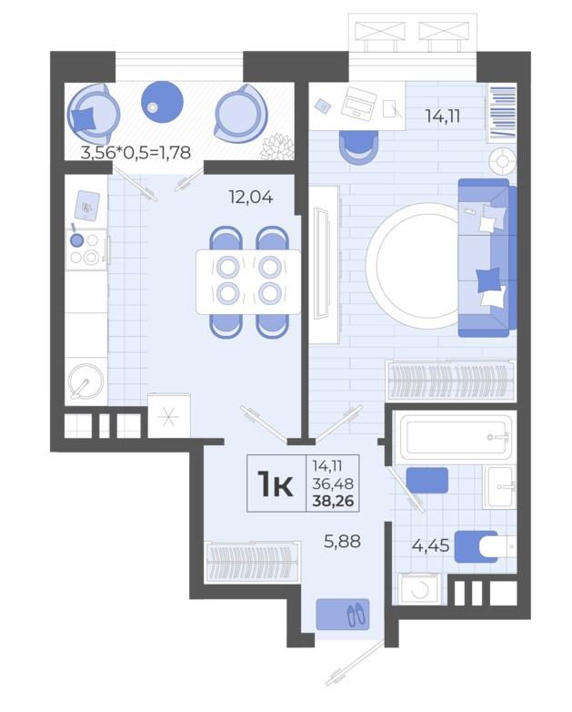 1-комн. 38.26 м²