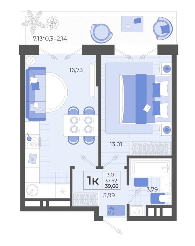 1-комн. планировка 39.66 м² в ЖК «Высочество»
