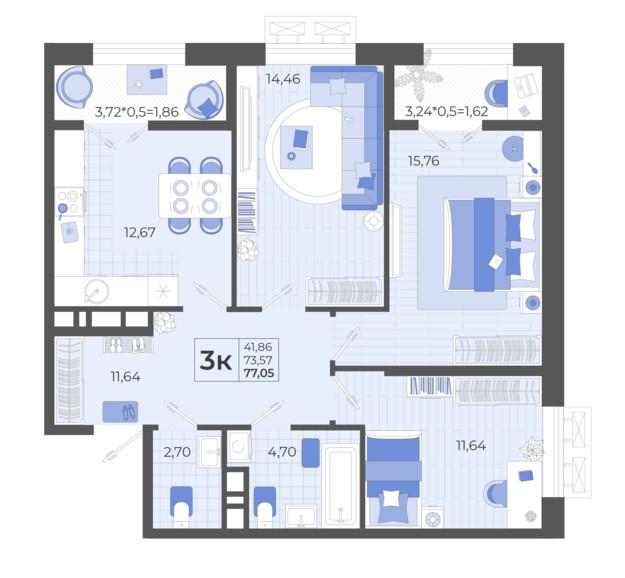 3-комн. планировка 77.05 м² в ЖК «Высочество»