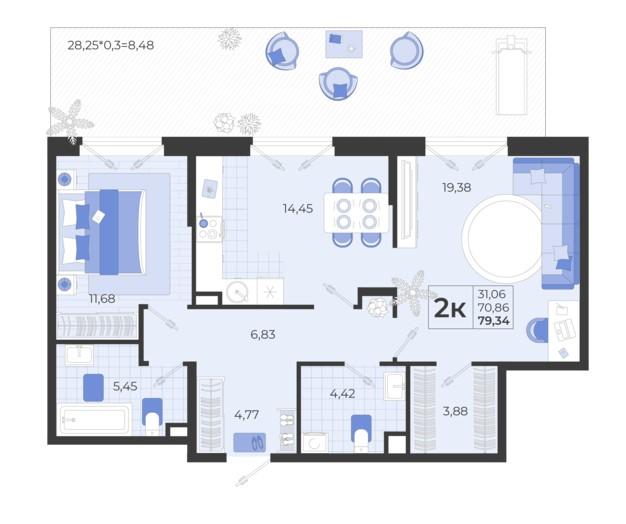 2-комн. планировка 79.34 м² в ЖК «Высочество»