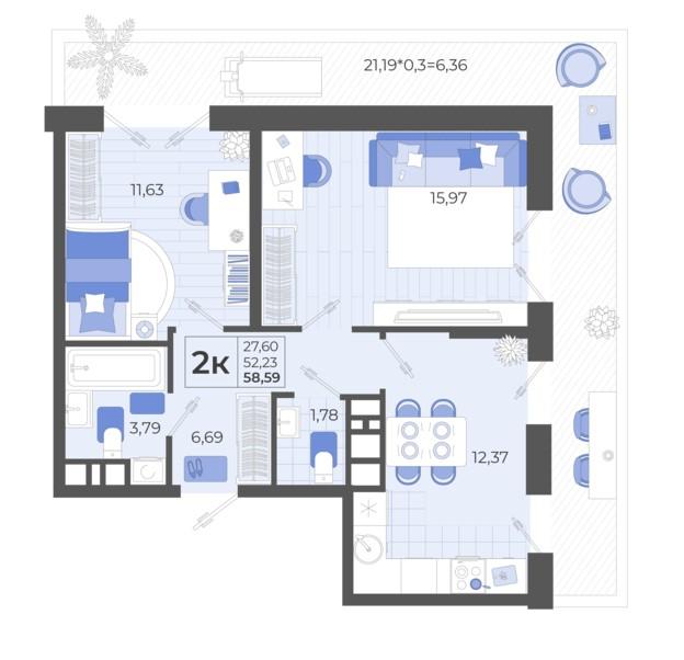 2-комн. планировка 58.59 м² в ЖК «Высочество»