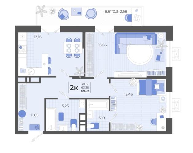 2-комн. планировка 69.93 м² в ЖК «Высочество»