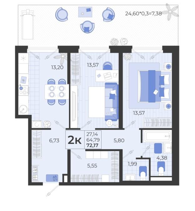 2-комн. планировка 72.17 м² в ЖК «Высочество»